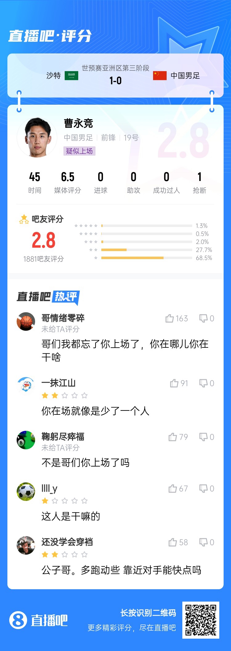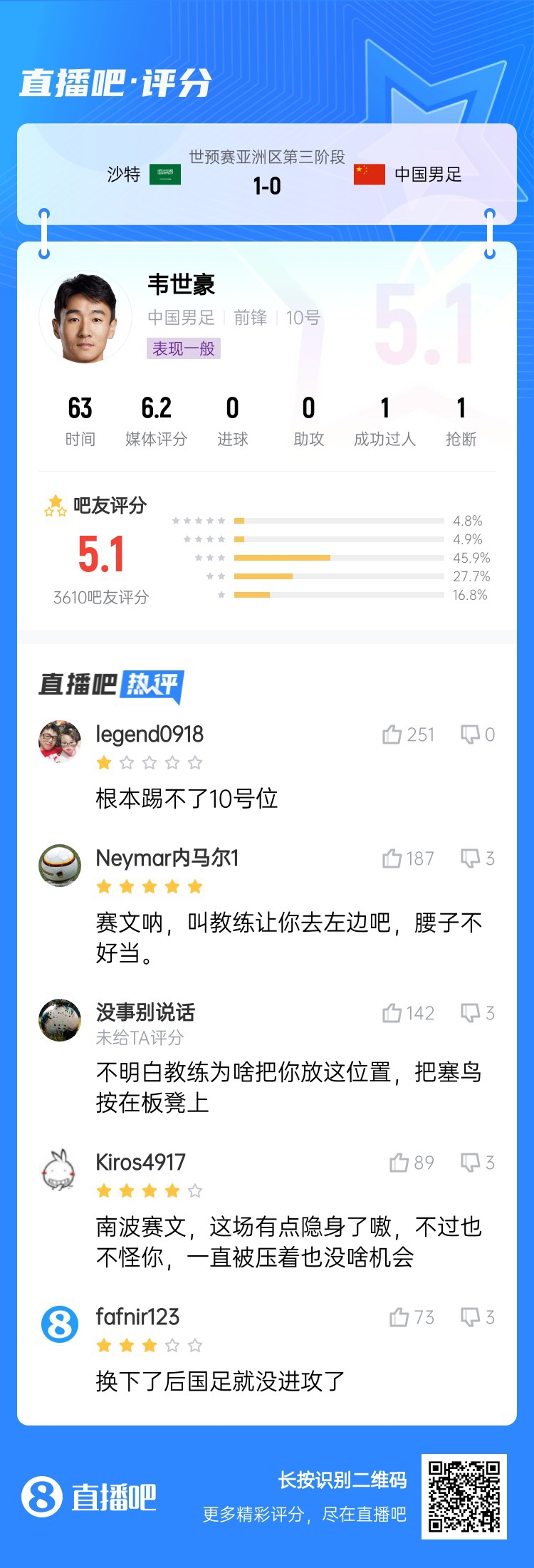 2025-03-21 17:46:20中场成短板!国足菱形中场评分普遍低迷,吧友:韦世豪踢不了10号