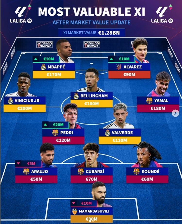 2025-03-22 06:06:22德转列西甲身价最贵阵:巴萨5人、皇马4将,小蜘蛛、玛玛达在列