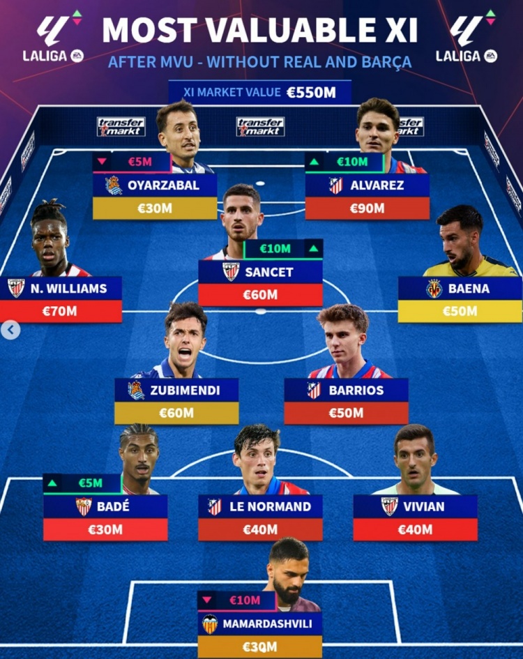 2025-03-22 11:30:54德转列西甲非皇萨球员最贵阵:阿尔瓦雷斯领衔,祖比门迪在列