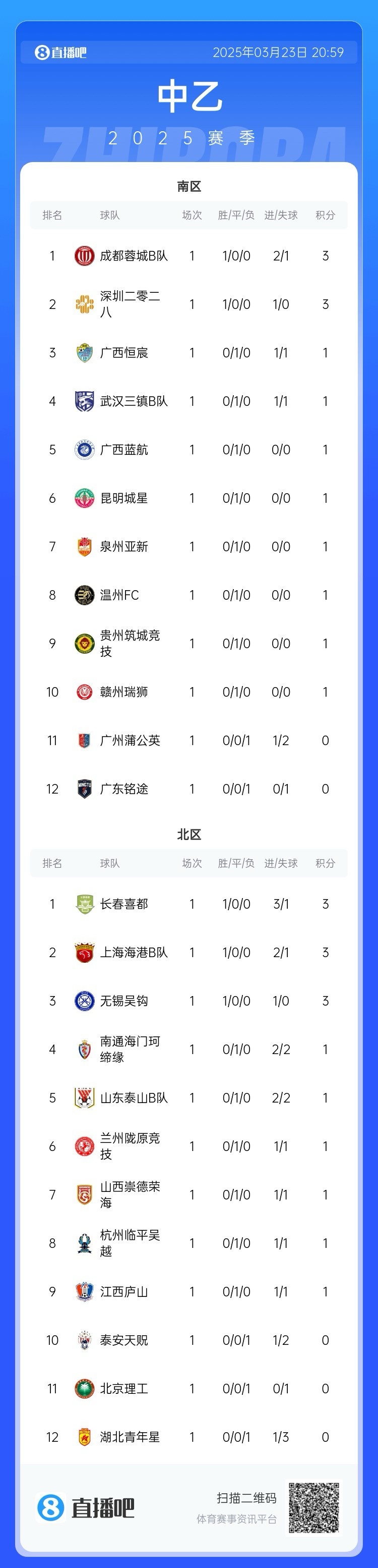 3月23日讯 中乙联赛第一轮今天结束全部争夺,蓉城B队2-1击败广州蒲公英,三镇B队战平广西恒宸,无锡吴钩、长春喜都、深圳二零二八收获开门红。