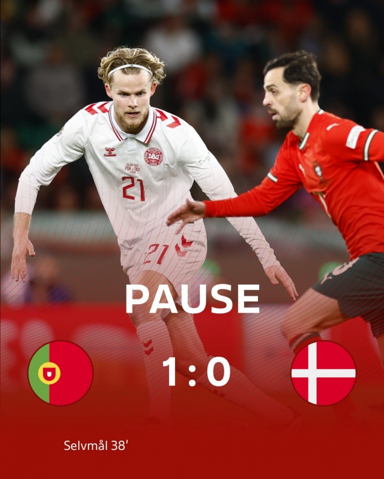 半场结束,葡萄牙1-0丹麦。