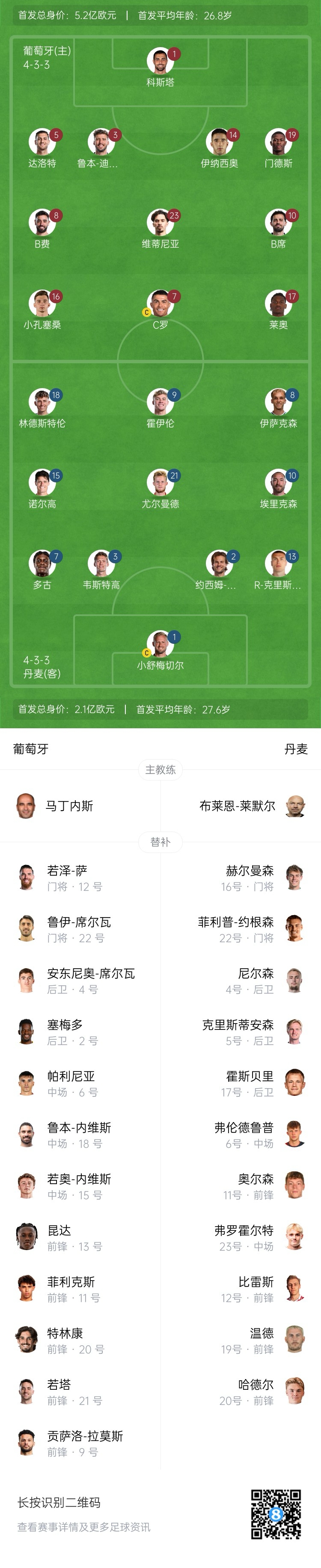 2025-03-24 06:41:21葡萄牙vs丹麦首发:C罗领衔,B费、B席、莱奥先发,霍伊伦出战