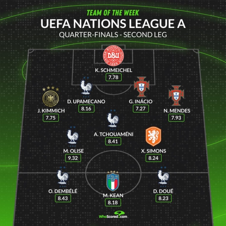 2025-03-24 18:42:42欧国联8强战次回合最佳阵:登贝莱领衔法国5将 小基恩&基米希在列