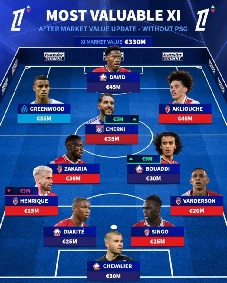 3月25日讯 德国转会市场更新了法甲球员的身价估值,并列出了目前法甲身价最高的阵容,该阵容由巴黎球员包揽。