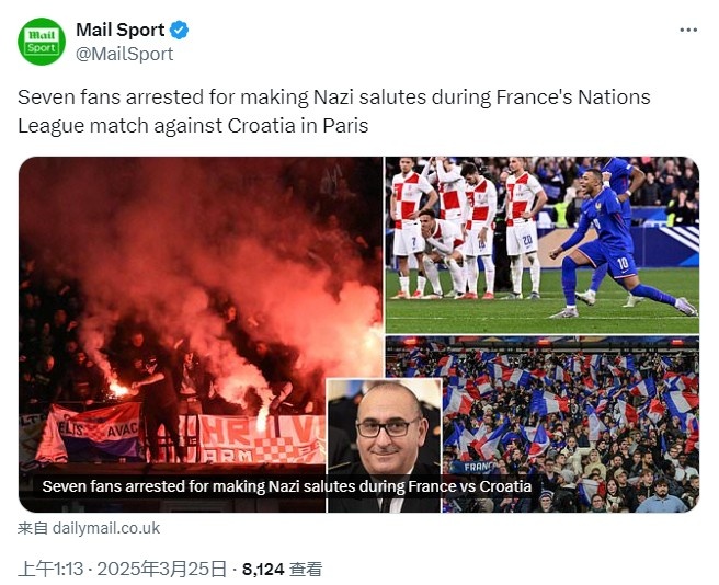 2025-03-25 09:12:29邮报:7名球迷因在法国vs克罗地亚比赛中行纳粹礼,被警方拘留