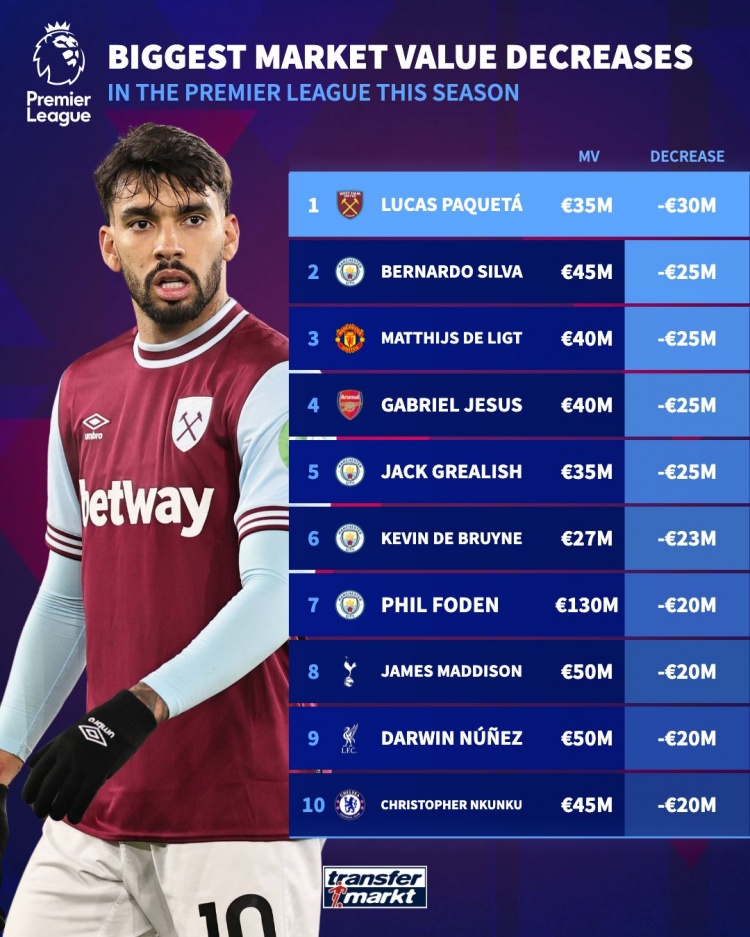 2025-03-26 18:48:59本赛季英超身价下跌榜:帕奎塔3000万欧,B席、德里赫特2500万欧