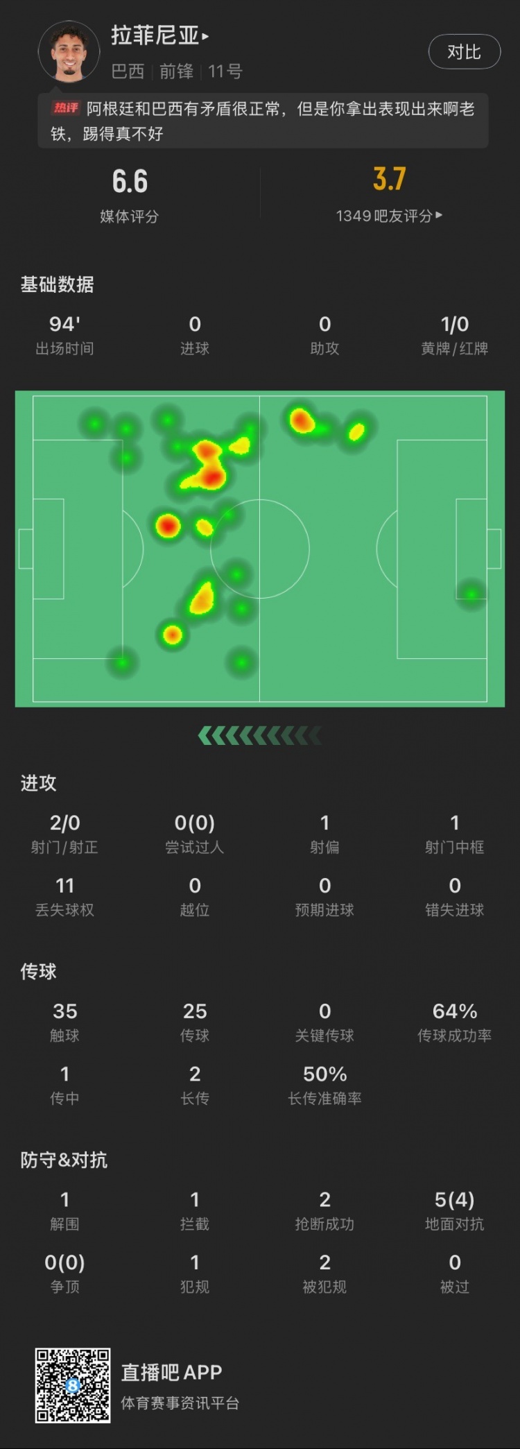 2025-03-26 19:05:16白放狠话了?拉菲尼亚本场:2射0正1中框,1黄牌,5次对抗成功4次