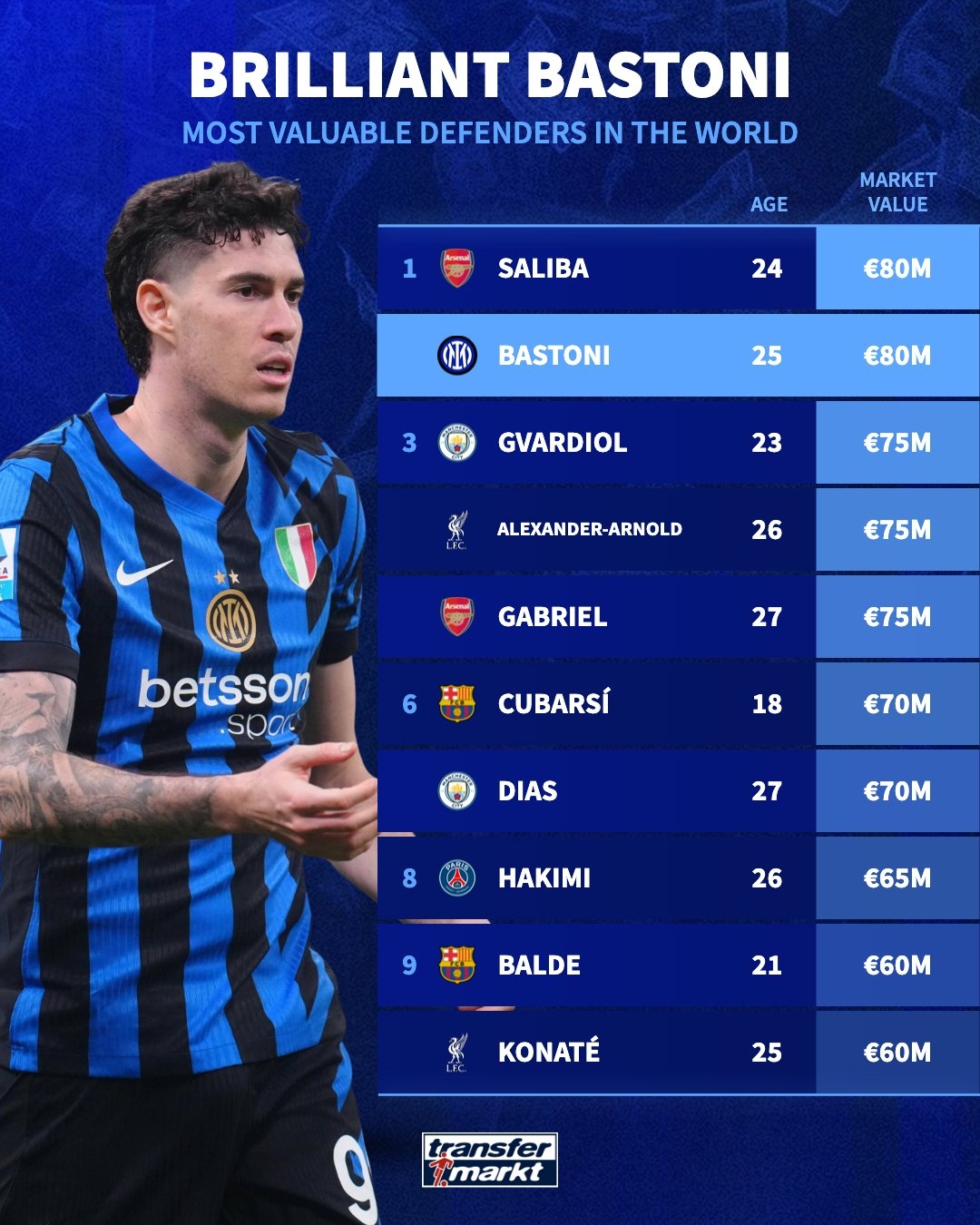 2025-03-26 19:10:55德转最新后卫身价top10:巴斯托尼8000万欧,与萨利巴并列第1