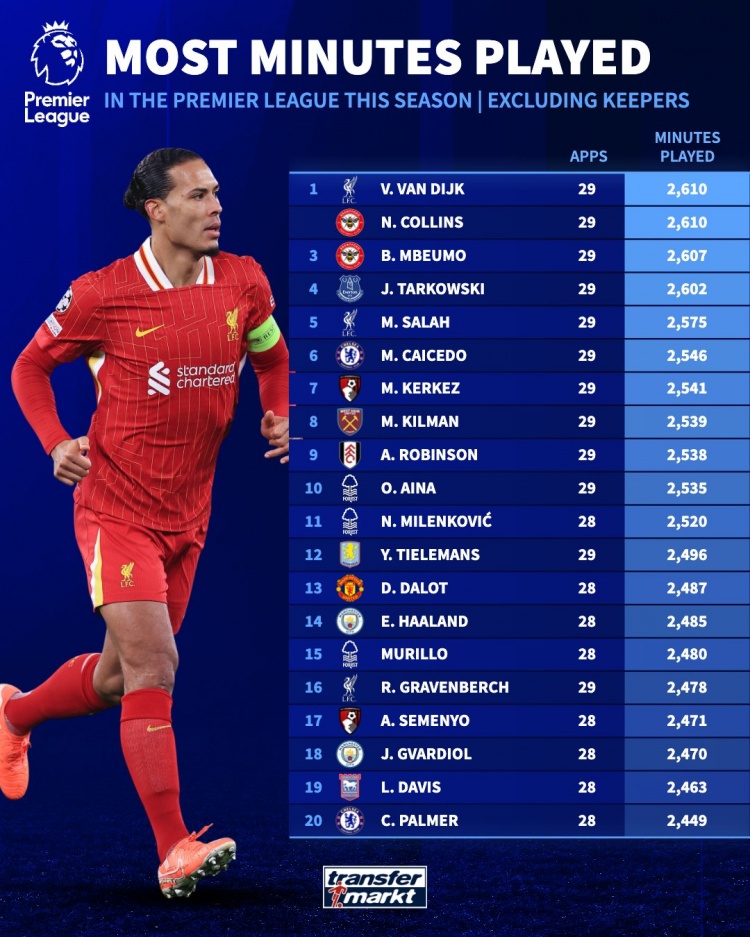 2025-03-27 06:56:24英超外场球员出场榜:范迪克打满29场居首,萨拉赫第5、凯塞多第6