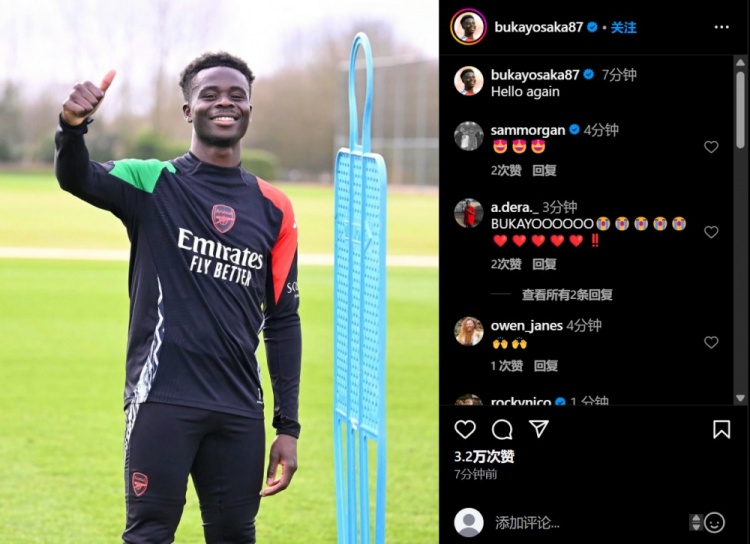 2025-03-28 00:35:35接近复出,萨卡社媒晒身穿训练服照片:又见面了