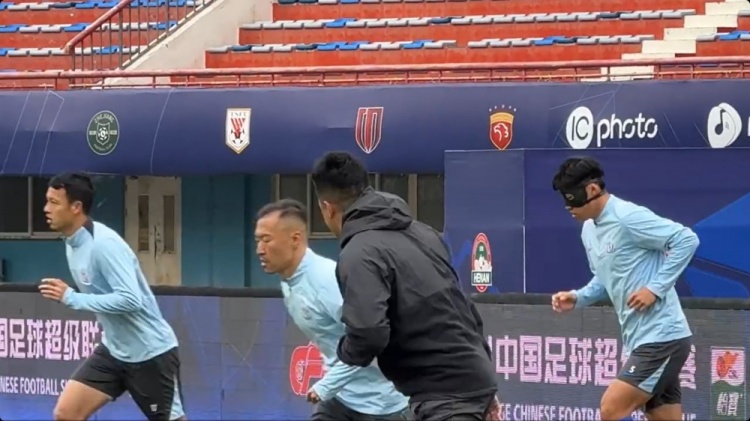2025-03-28 18:56:10申花今天赛前踩场训练,中卫朱辰杰戴面具参加