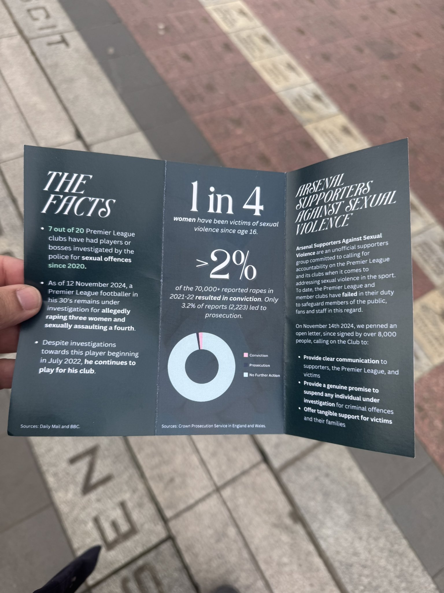其中一页写道:“阿森纳球迷反对性暴力组织是一个非官方的支持者团体,致力于呼吁英超联赛及其俱乐部在解决体育运动中的性暴力问题时承担责任。迄今为止,英超联赛及其成员俱乐部在这方面未能尽到保护公众、球迷和工作人员的责任。”