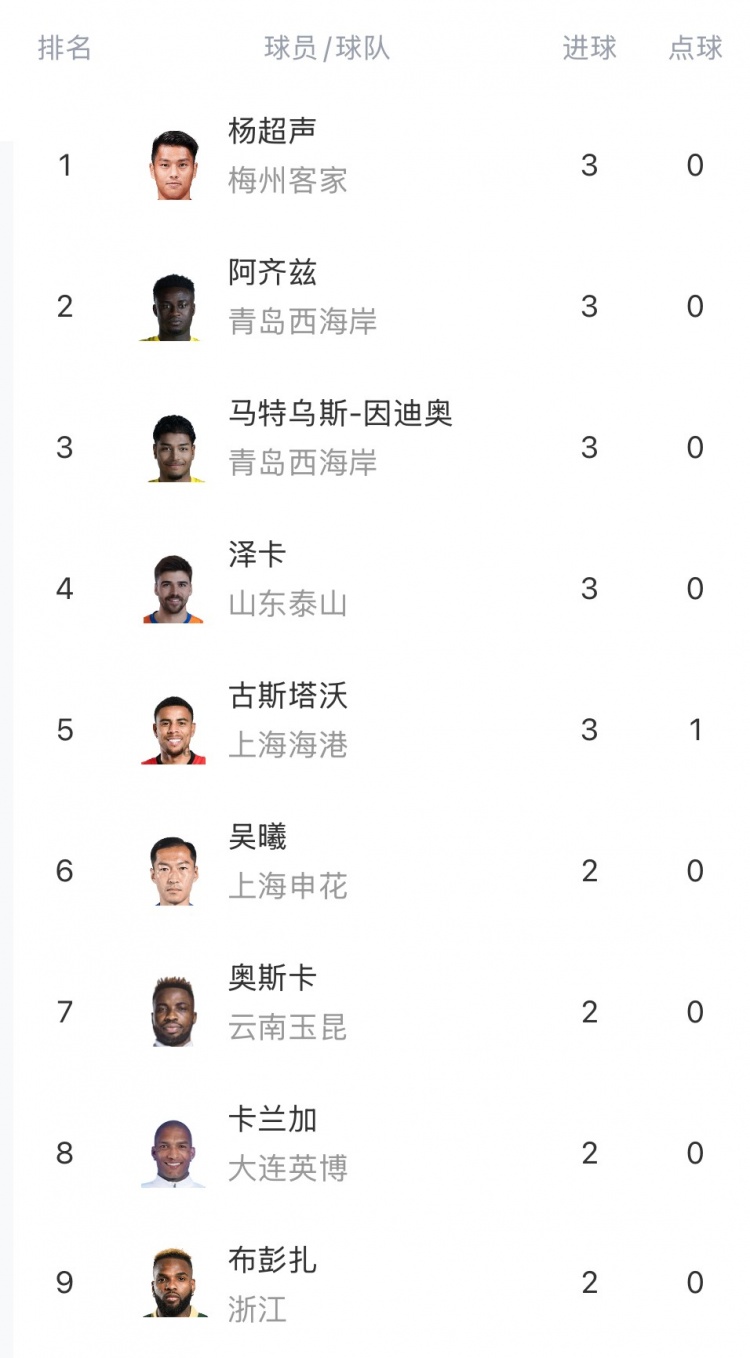 2025-03-30 18:01:22中超射手榜:杨超声、泽卡、阿齐兹、马特乌斯、古斯塔沃3球居首