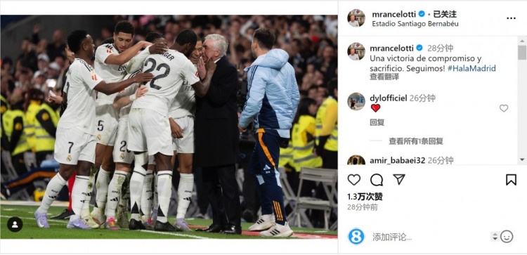2025-03-30 18:01:30安切洛蒂社媒:这是奉献和牺牲精神带来的胜利,我们继续前进!