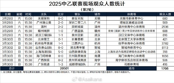 2025-03-31 12:10:03中乙第2轮现场观众:四场超千人,泰山B队主场8113人最多