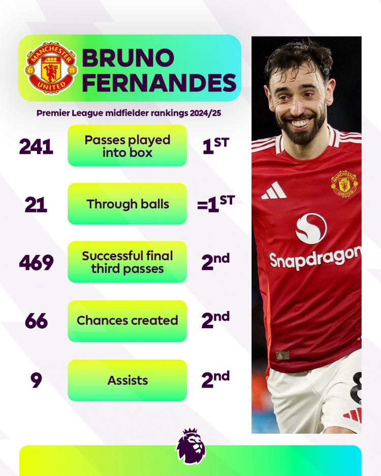 2025-03-31 22:02:06曼联大腿!B费本赛季传入禁区、直塞英超中场最多,助攻第二多