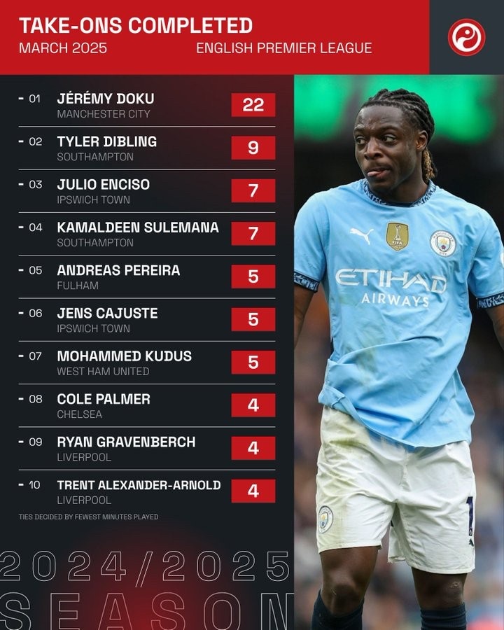 2025-04-01 12:30:04英超过人王!多库在三月的英超比赛中成功完成22次过人位列第一