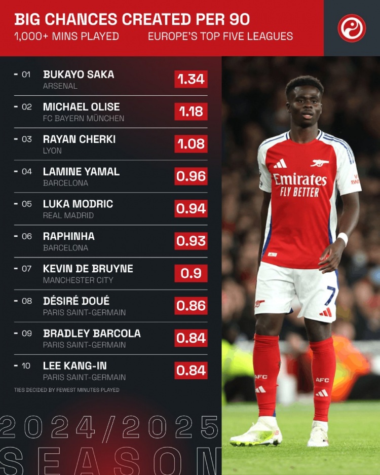 2025-04-01 12:30:31五大联赛每90分钟创造重大机会榜:萨卡1.34次居首,奥利塞次席