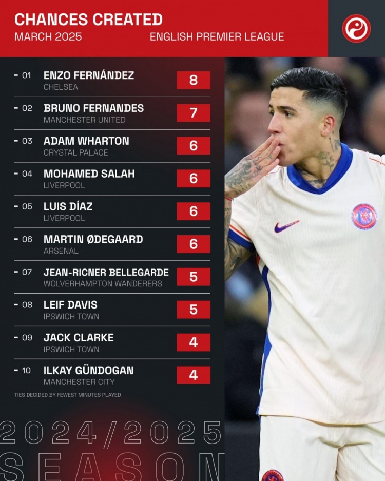 2025-04-01 12:30:53英超3月创造机会排名:恩佐8次居首,B费7次&萨拉赫6次