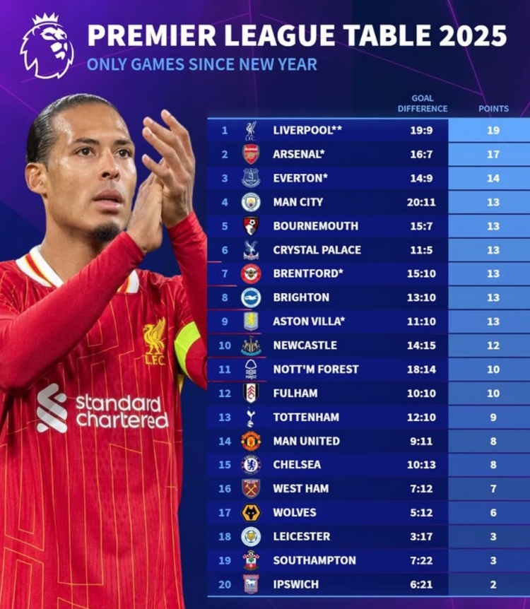 2025-02-26 07:02:352025英超积分榜:利物浦19分、阿森纳17分,曼联切尔西各8分