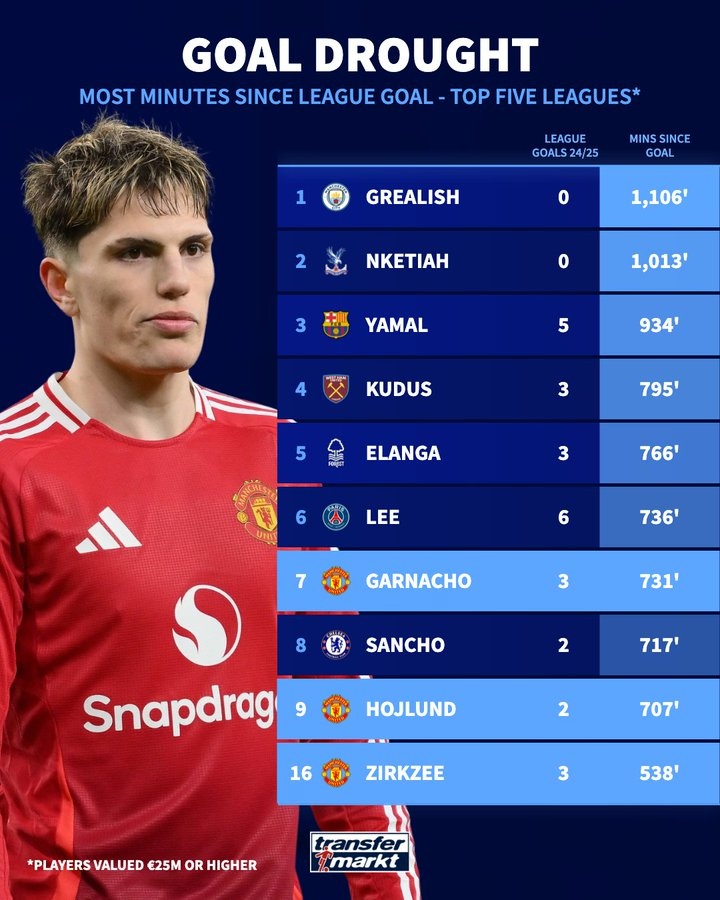 2025-02-26 07:02:38五大联赛进球荒时间排名:格拉利什1106分钟居首 亚马尔934分钟