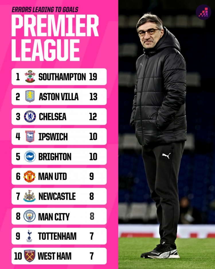 2025-02-26 21:03:45南安普顿本赛季因失误丢掉19球英超最多,比第二名维拉多出6球