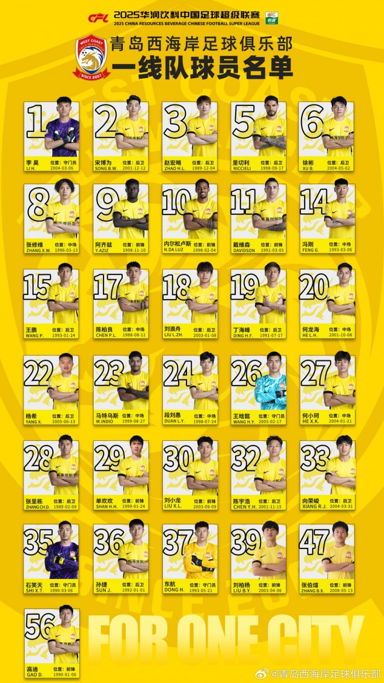 2月21日讯 今日,青岛西海岸官媒公布了新赛季一线队球员名单,具体如下: