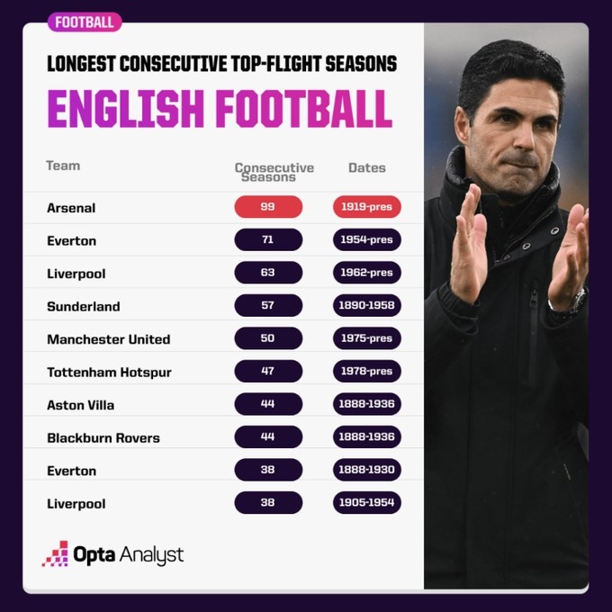 2025-02-27 07:00:31英格兰第一!阿森纳将连续100个赛季征战英格兰顶级联赛
