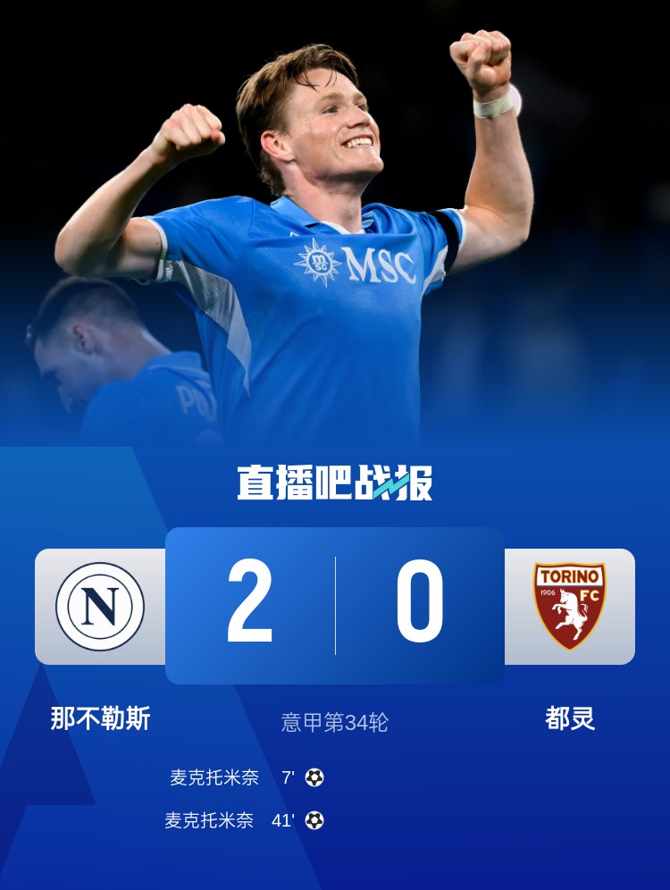 麦克托米奈梅开二度,那不勒斯2-0击败都灵,取得联赛3连胜,以3分优势领跑意甲。
