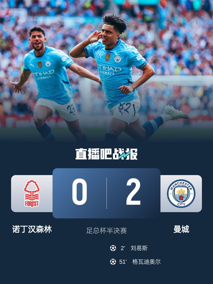 刘易斯闪击得手,格瓦迪奥尔头球破门,曼城2-0诺丁汉森林连续三年进决赛将战水晶宫。