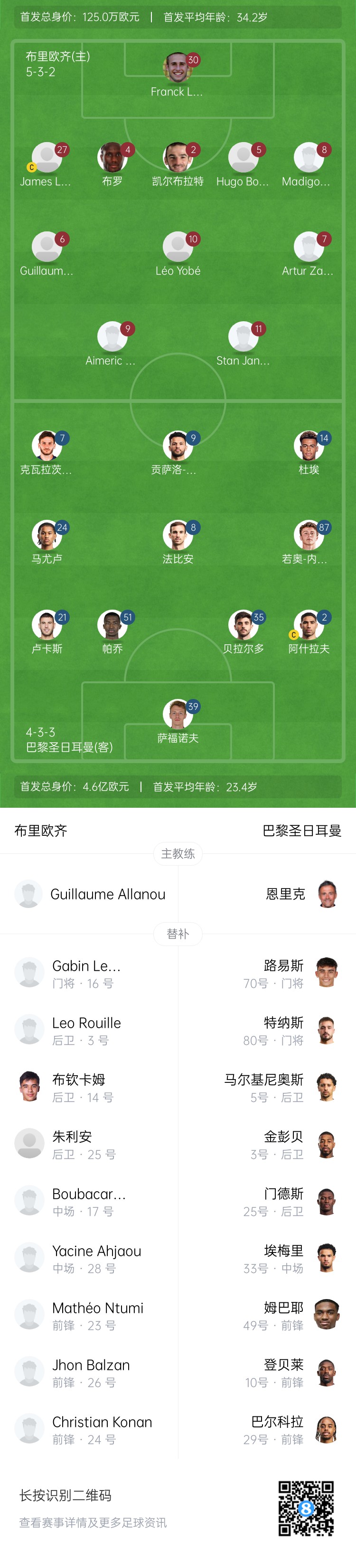 02月26日讯 法国杯1/4决赛,布里欧齐主场vs巴黎圣日耳曼即将打响。赛前首发出炉。