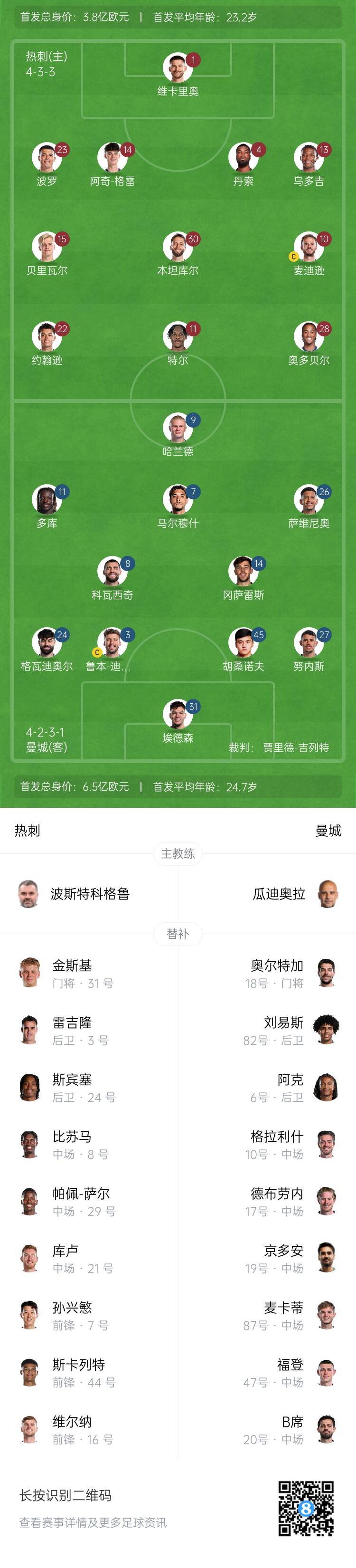 2025-02-27 07:01:39热刺vs曼城首发:孙兴慜替补,哈兰德、马尔穆什、多库出战