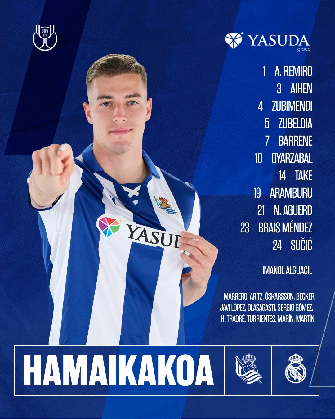 皇家社会替补:13-马雷罗、6-埃卢斯通多、9-奥斯卡松、11-贝克、12-哈维-洛佩斯、16-奥拉萨加斯蒂、17-塞尔吉奥-戈麦斯、18-哈马里-特拉奥雷、22-特伦特斯、28-巴勃罗-马林、36-乔恩-马丁