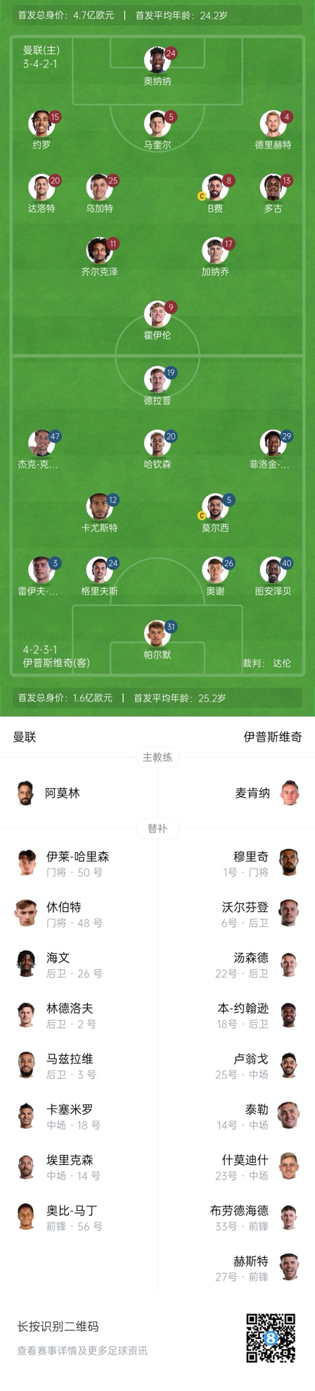 曼联首发:24-奥纳纳、4-德里赫特、5-马奎尔、15-约罗、20-达洛特、25-乌加特、8-B费、13-多尔古、17-加纳乔、11-齐尔克泽、9-霍伊伦