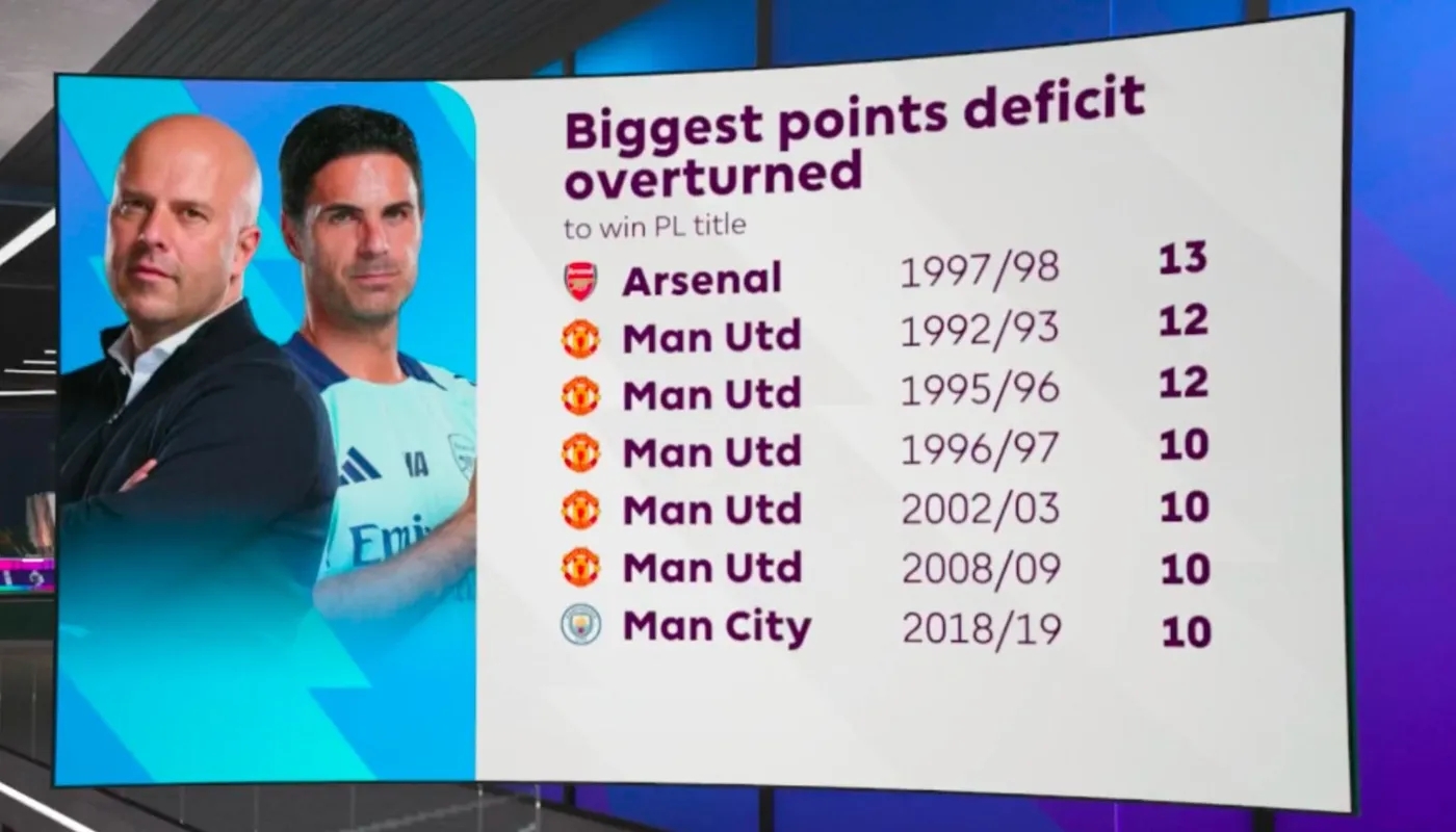 2025-02-27 14:00:23有先例!97/98赛季阿森纳落后13分翻盘夺冠,但...