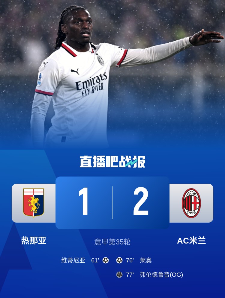 莱奥破门,菲利克斯造乌龙,米兰2-1击败热那亚,各项赛事取得三连胜。