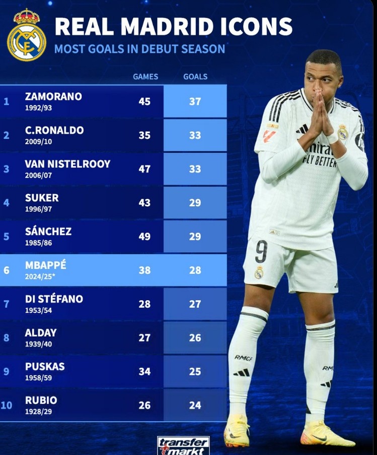 2025-02-27 21:01:54皇马队史首秀赛季进球榜:萨莫拉诺37球居首,姆巴佩28球第6