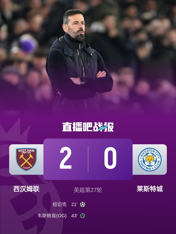 英超第27轮,莱斯特城客场0-2不敌西汉姆,遭遇各赛事5连败。