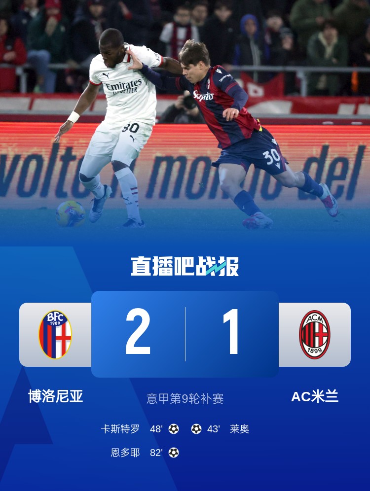 莱奥破门,米兰1-2遭博洛尼亚逆转,意甲两连败跌至第8名。