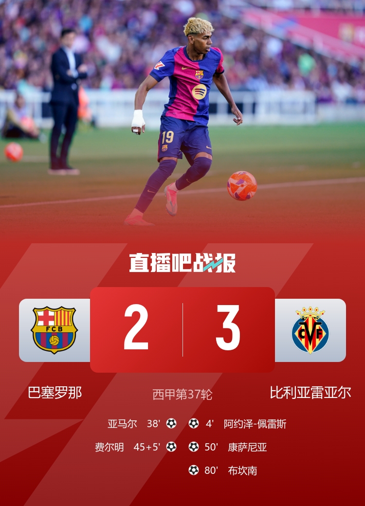 西甲联赛第37轮,巴萨2-3比利亚雷亚尔,亚马尔、费尔明进球。