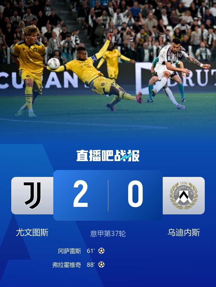 意甲第37轮,尤文图斯2-0乌迪内斯,掌握争四主动权,冈萨雷斯、弗拉霍维奇进球。