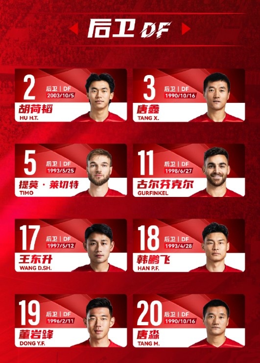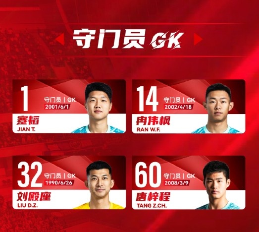 门将:1-蹇韬、14-冉伟枫、32-刘殿座、60-唐梓程
