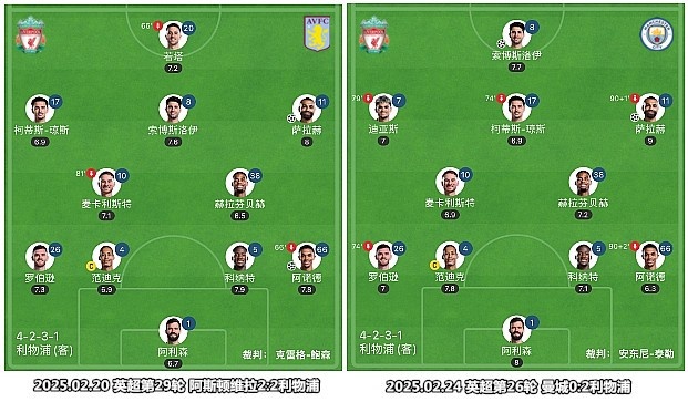四天内两战强敌,利物浦的首发阵容只有1处变化,斯洛特使用了两种截然不同的阵型和打法。