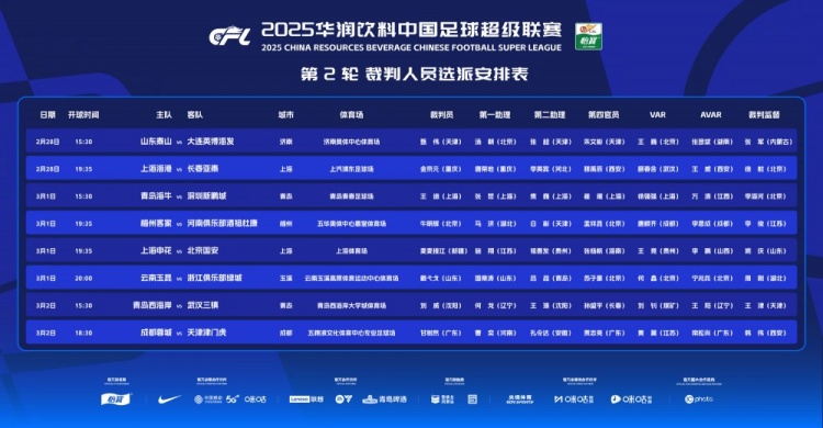 2025-02-28 14:00:46中超第2轮裁判安排:麦麦提江吹罚申花vs国安,VAR王竞,无李海新