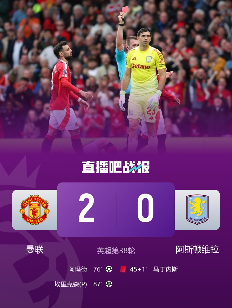 第15收官!曼联2-0十人维拉 阿玛德造两球大马丁直红维拉无缘欧冠