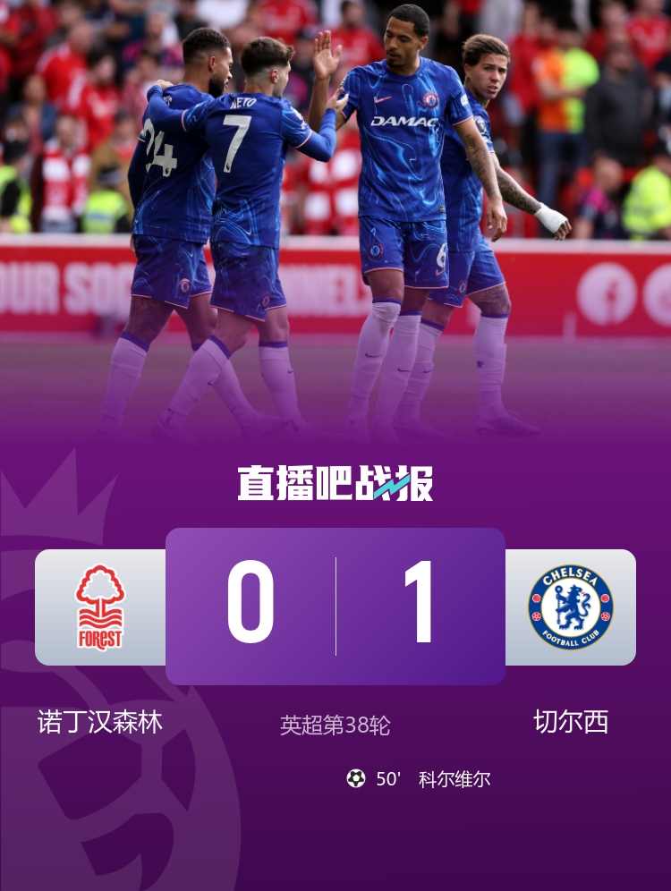 锁定欧冠!切尔西1-0森林 蓝军第四收官科尔维尔制胜森林踢欧协联