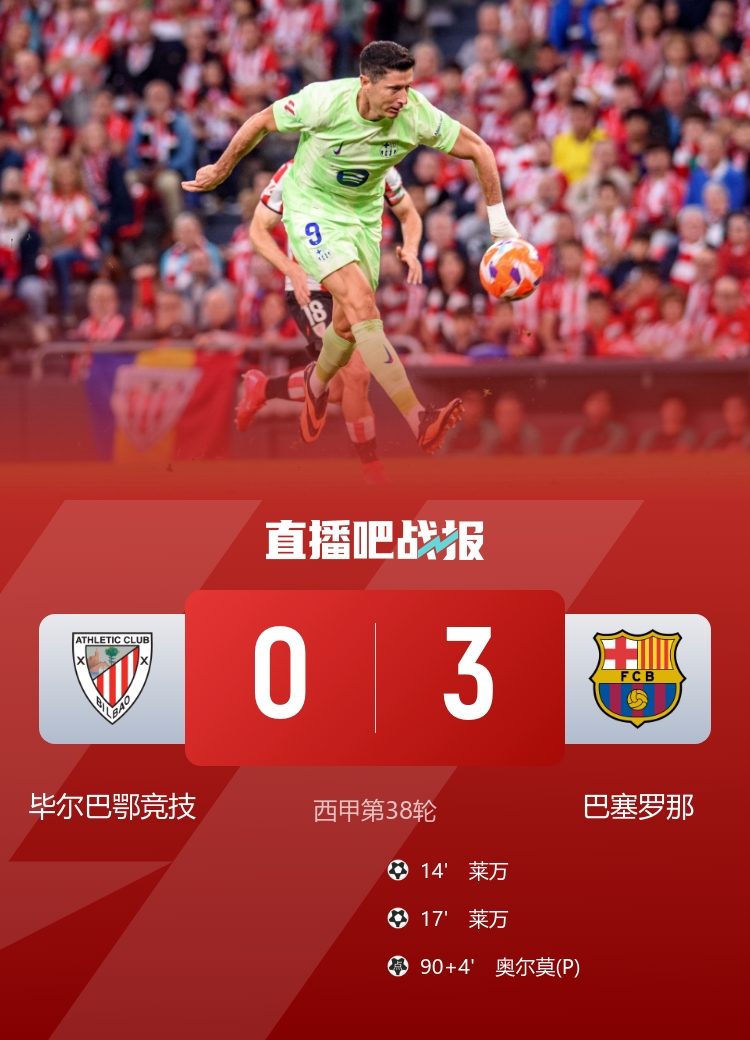 巴萨3-0击败毕巴,结束本赛季西甲征程,莱万打入两球,奥尔莫破门。