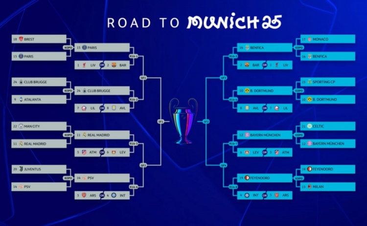 2024/25赛季欧冠16强淘汰赛对阵抽签将于北京时间今天晚上19:00进行,抽签地点位于瑞士尼翁。