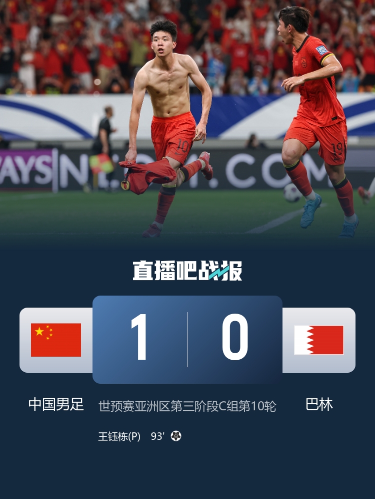 国足主场1-0绝杀+双杀巴林赢下荣誉战,王钰栋处子球,国足终结世预赛4连败,积9分位居小组倒数第二收官。
