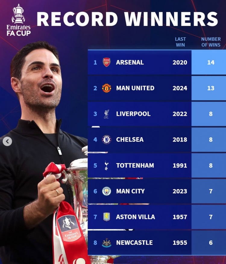 2025-03-01 07:01:05本届BIG6仅剩曼市双雄!足总杯历史夺冠榜:阿森纳14次、曼联13次